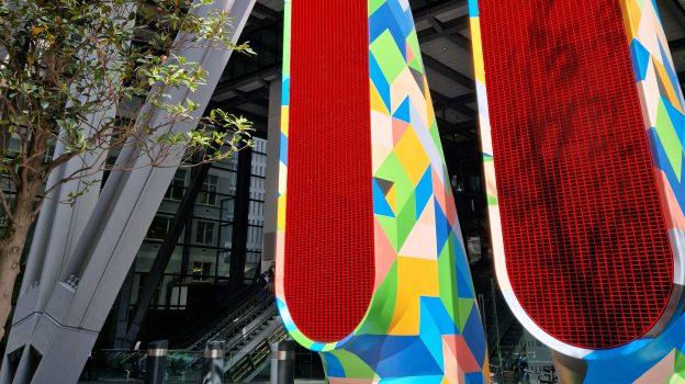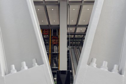 The lifts, toilets and services that heat and cool the building are housed in the north core, where blocks of primary colour transform the building’s essential functions into a dynamic and eye-catching display.