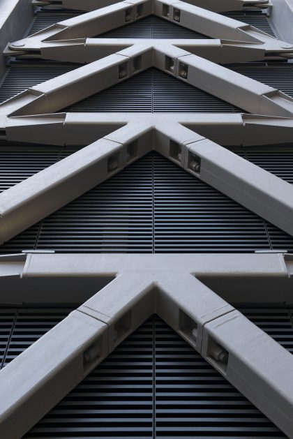 Steel K bracing adds rigidity to the megaframe, which houses the unusually open-plan office floors.